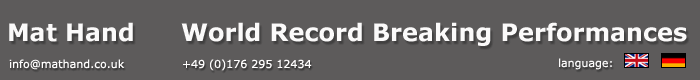 World Record Breaking Performances encourage debate regarding the importance of the live experience and the role of Live Art documentation. Witnessing and evidence play an integral and dual role insofar as they are required by Guinness World Records© and therefore must be adhered to strictly during the performances. It is through these events that Mat Hand aims to explore his own relationship with the compulsion to make a mark, the cultural position and function of World Records and the possibilities for their artistic re-representation/interpretation through Live Art and installation. |