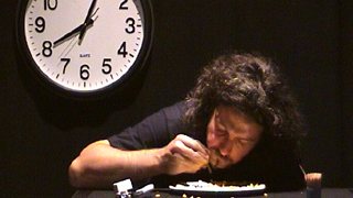 His shows allow the audience to investigate the lengthy processes, the rules and strict guidelines that are stipulated by Guinness World Records© as well as offering the chance to experience World Record breaking in a controlled and stylised environment. In trying to find a place for non-theatrical actions within a performative space he presents these unpredictable live moments which ebb and flow with repeated failure and fleeting success.